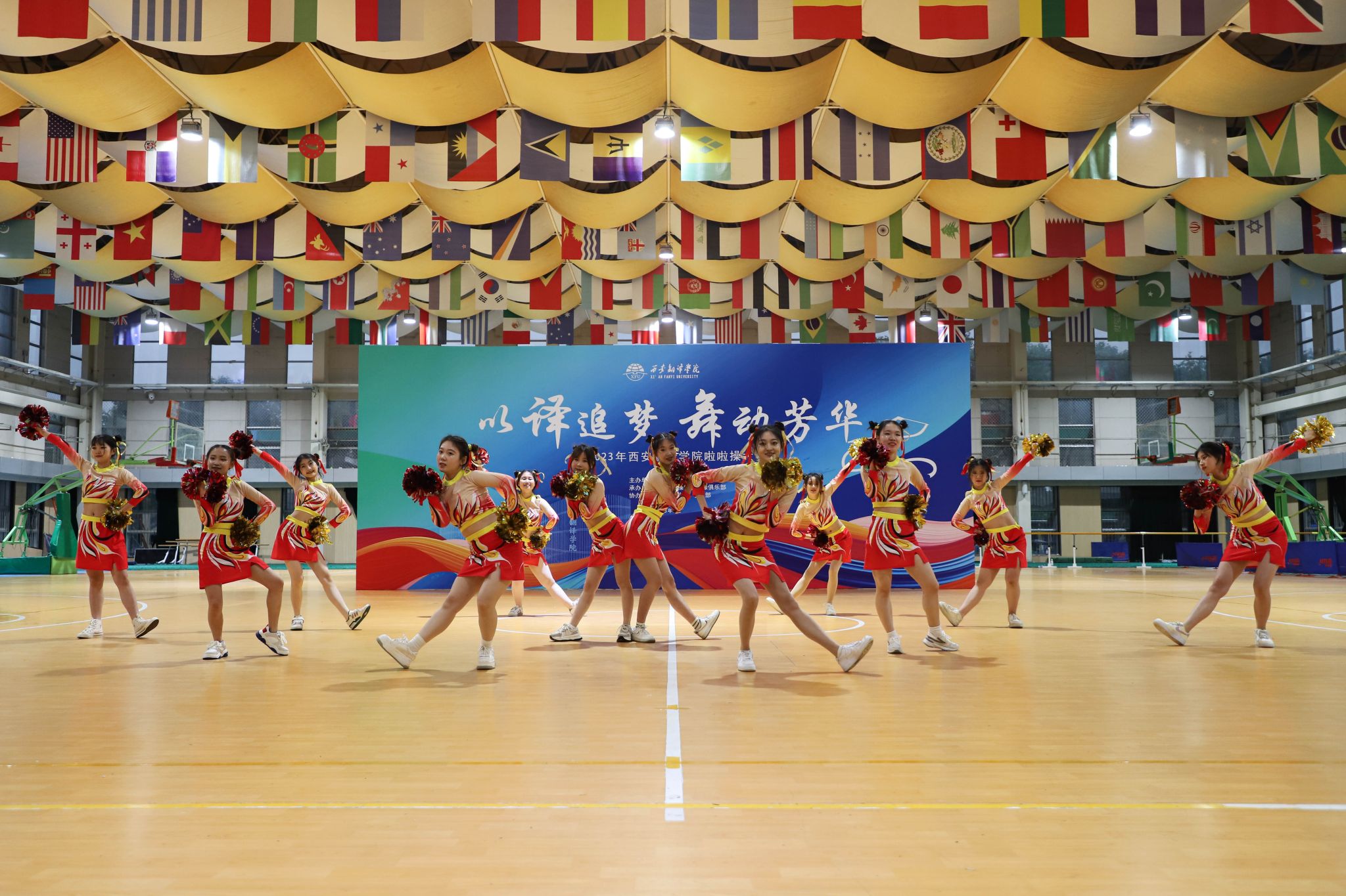 本次比赛共有来自各二级学院的十三支参赛队伍参加。在啦啦操队员们热烈的开场舞后,裁判员及运动员代表宣誓,大赛正式拉开帷幕。来自艺术与设计学院的“花火队”随着节拍迈着轻盈的步伐,身姿律动、活力动感的舞姿给在场观众留下深刻印象,表演者们踏着轻快的步伐,精彩的表演让大家眼前一亮,整齐划一的动作与振奋人心的音乐完美融合,将现场的气氛推向高潮。英文学院队伍“China-X队”的参赛者们配合默契,精心编排的动作与动感十足的音乐相得益彰,热情与汗水挥洒在灯火之下,展现出英文学院学子独特的艺术魅力与出色的舞台表现,完美诠释了本次大赛“以译追梦,舞动芳华”的中心主题,体现了西译学子朝气蓬勃、锐意进取、积极向上的精神风貌。亚欧语言文化学院代表的“A队”队员们身着统一服装,手持花球,迈着自信的步伐登场,脸上洋溢着笑容,动作整齐有力、干净利落,用炙热的青春编织着独属于他们的浪漫。
