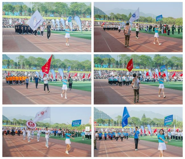 伴随着振奋人心的《运动员进行曲》,国旗护卫队以挺拔的身姿护送着国旗与校旗,整齐划一、昂首阔步地通过主席台。紧随其后的是会徽队、花束队、红旗队,裁判员、教职工方阵,国际交流学院及各二级学院运动员、青年志愿者协会、后勤集团代表队。他们步伐整齐、口号嘹亮、目光坚定地走过主席台,以积极饱满的精神接受全校师生的检阅。