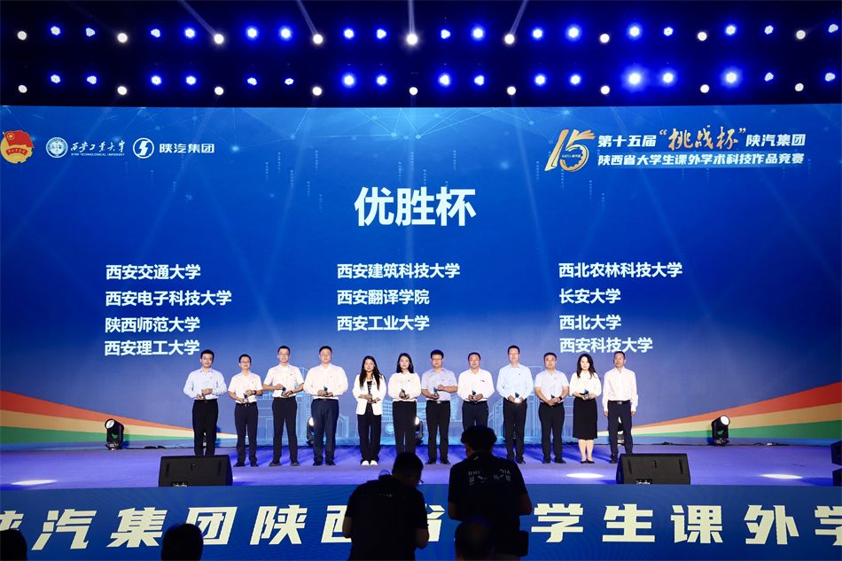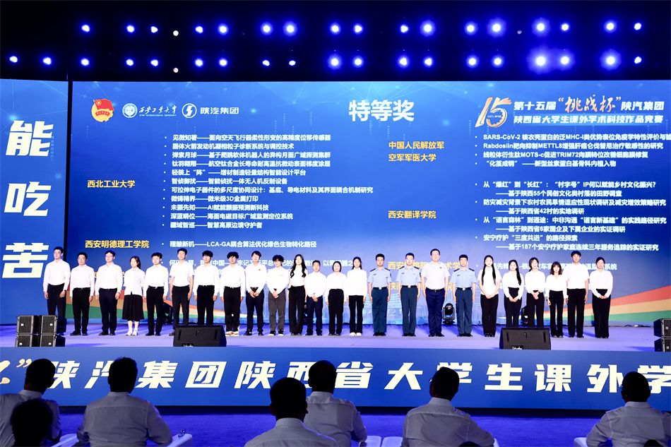 在5月24日闭幕的第十五届“挑战杯”陕西省大学生课外学术科技作品竞赛颁奖典礼上,我校报送的12件作品全部进入现场决赛,获特等奖4项,一等奖6项,二等奖2项,总分900分,位列全省第六。我校在此项赛事中,连续六年持续突破。继2022、2024年两次捧得“小挑”优胜杯后,此次首次捧得“大挑”优胜杯并获“进步显著奖”,位居同类院校第一,创造了校参赛史上的里程碑式突破。