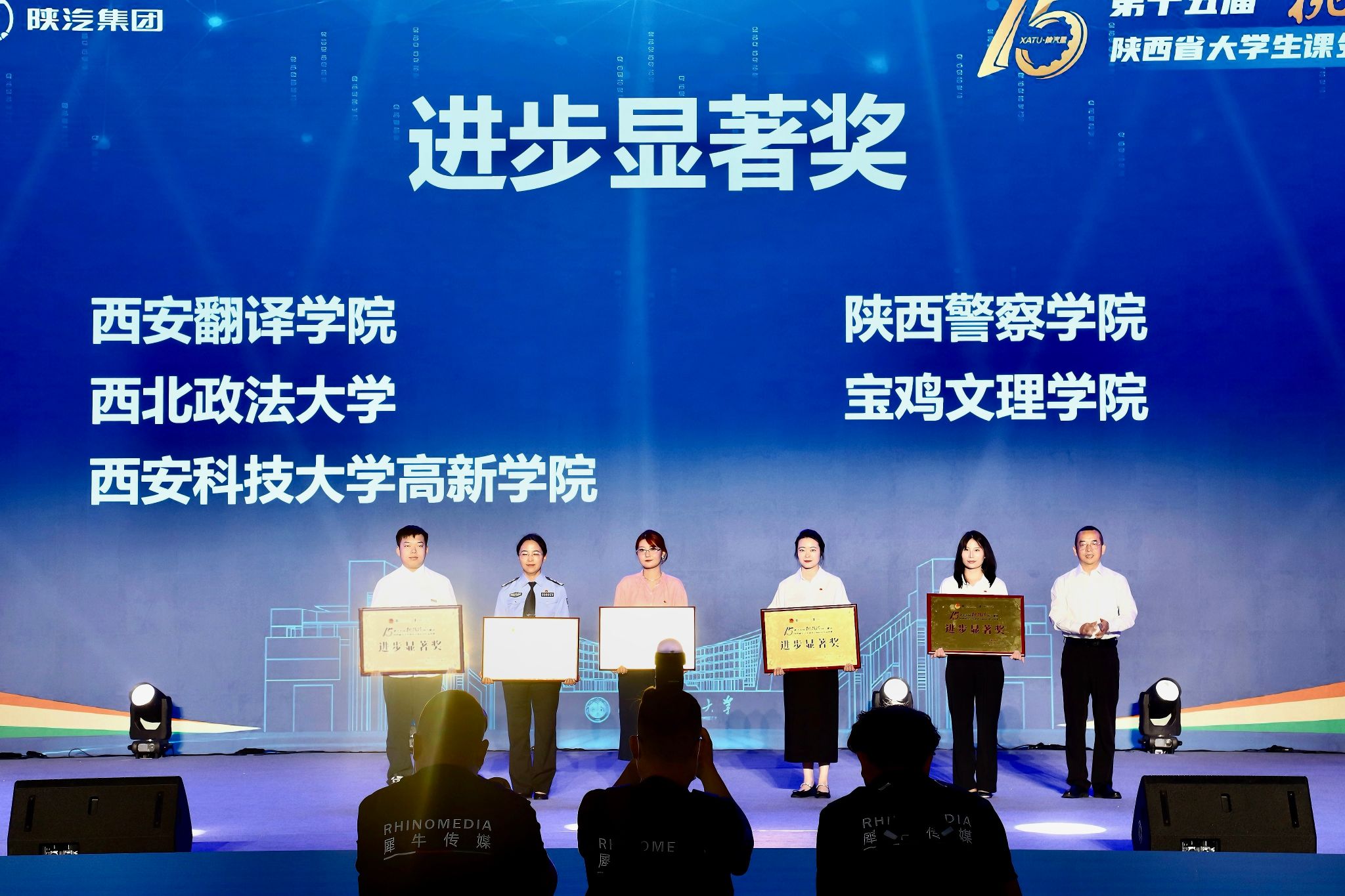 团委姚天乐老师(左一)代表我校上台领取“进步显著奖”奖牌