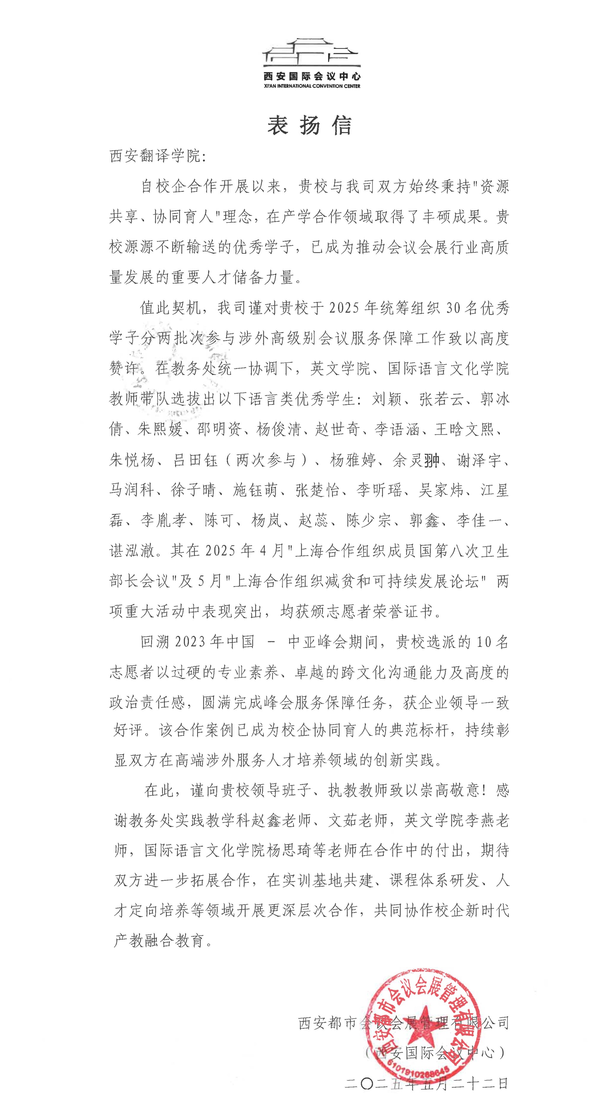 近日,我校收到来自西安国际会议中心的表扬信,信中高度肯定了我校在高端涉外服务人才培养方面的卓越成效,并特别赞扬了我校学生在上海合作组织成员国第八次卫生部长会议、上海合作组织减贫和可持续发展论坛等重大国际会议中的出色表现。这不仅是对学生专业能力的认可,更是对学校深化产教融合、创新实践教学模式的有力印证。