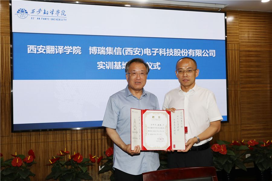7月4日,西安翻译学院与博瑞集信(西安)电子科技股份有限公司实训基地揭牌仪式在西译举行。博瑞集信(西安)电子科技股份有限公司理事长、总经理张博与西安翻译学院校长崔智林共同为集成电路产教融合实训基地揭牌。副校长王霖、信息工程学院院长葛海波等领导出席活动。副校长王利晓主持揭牌仪式。