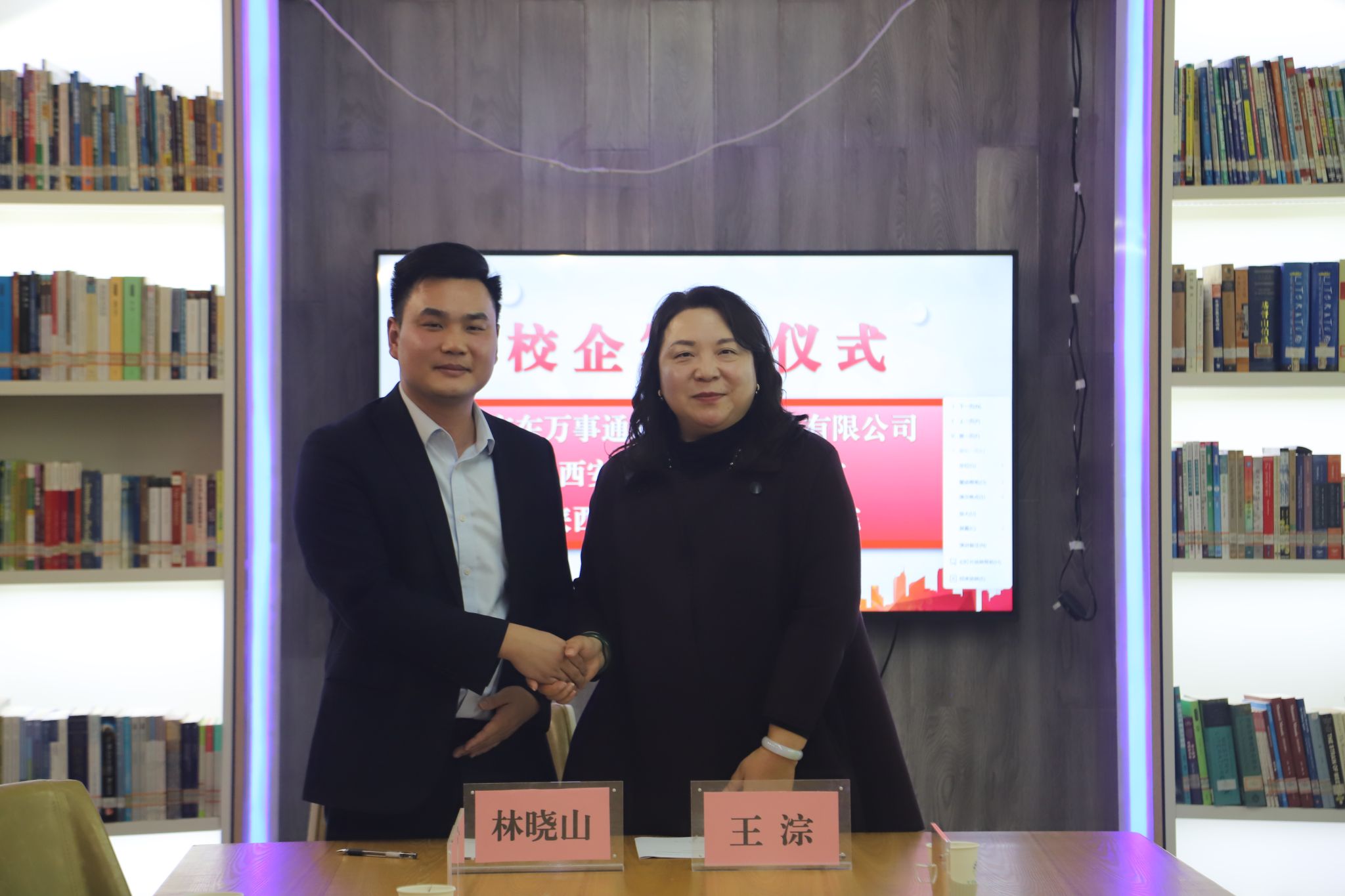 洽谈结束后,双方领导分别代表校企双方签署合作协议,王淙与林晓山分别代表陕西颖创跨境贸易研究院和企业签署合作协议。