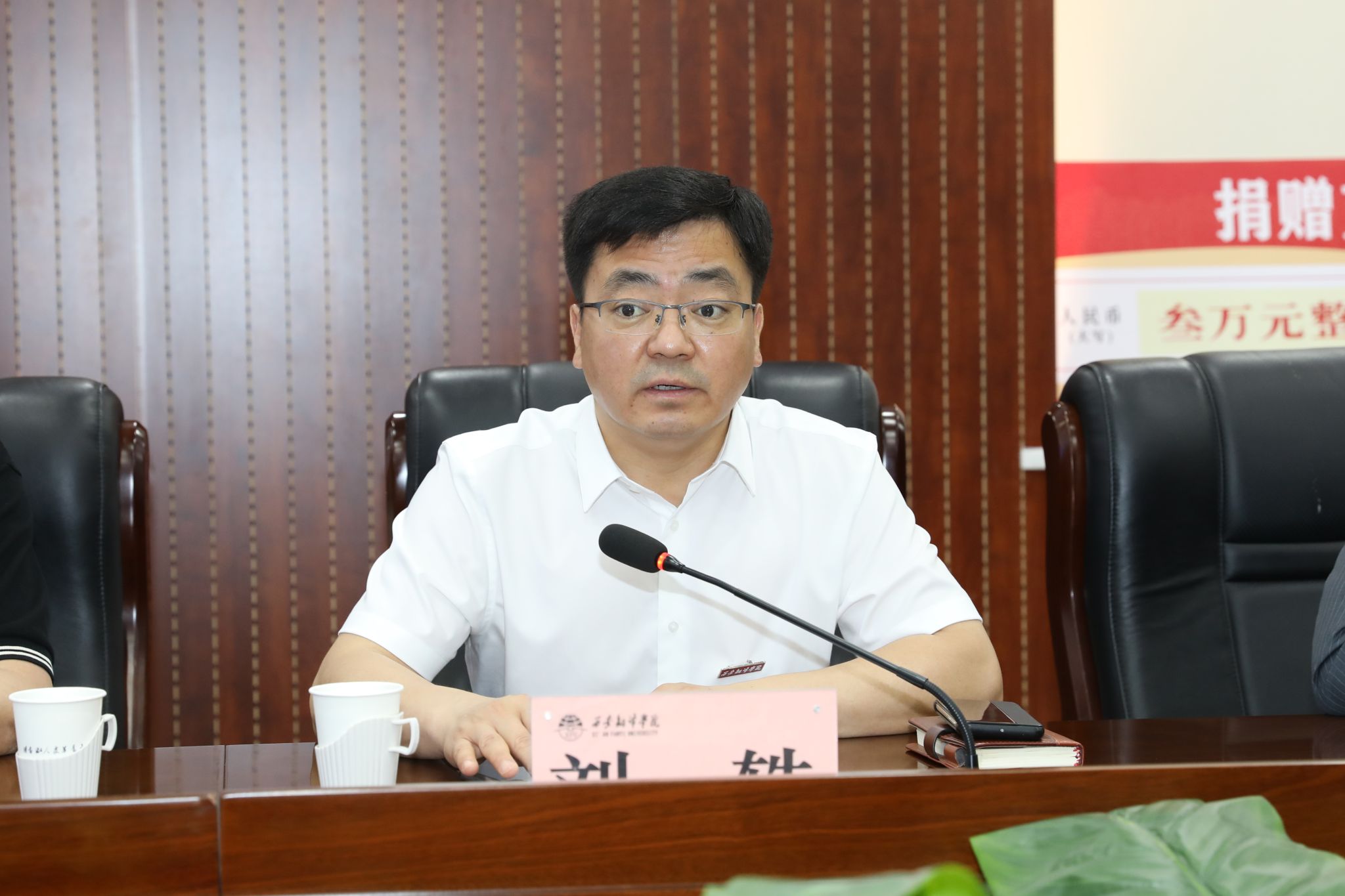 王霖代表学校师生和丁祖诒教育基金会对陕西大唐风范教育科技集团有限公司理事长田广斌先生心系教育、爱心助学的义举表示衷心感谢,并向与会师生介绍了该公司的发展情况。他表示,陕西大唐风范教育科技集团有限公司受双减政策的影响,发展不易,但仍然慷慨解囊,传递爱心,助力西译人才培养,这充分彰显了田广斌理事长的企业家精神和社会责任感以及他对民办教育事业的关心和支持。王霖承诺将严格按照学校相关政策要求,将助学金发放到真正需要资助的学生身上,帮助他们顺利完成学业。王霖鼓励受助学生勤奋学习,心怀感恩,以优异的成绩回报学校和社会。
