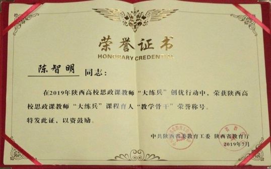 陈智明教师在2019年陕西省思政课教师大练兵创优行动中,荣获陕西高校思政课教师大练兵课程育人教学骨干荣誉称号。